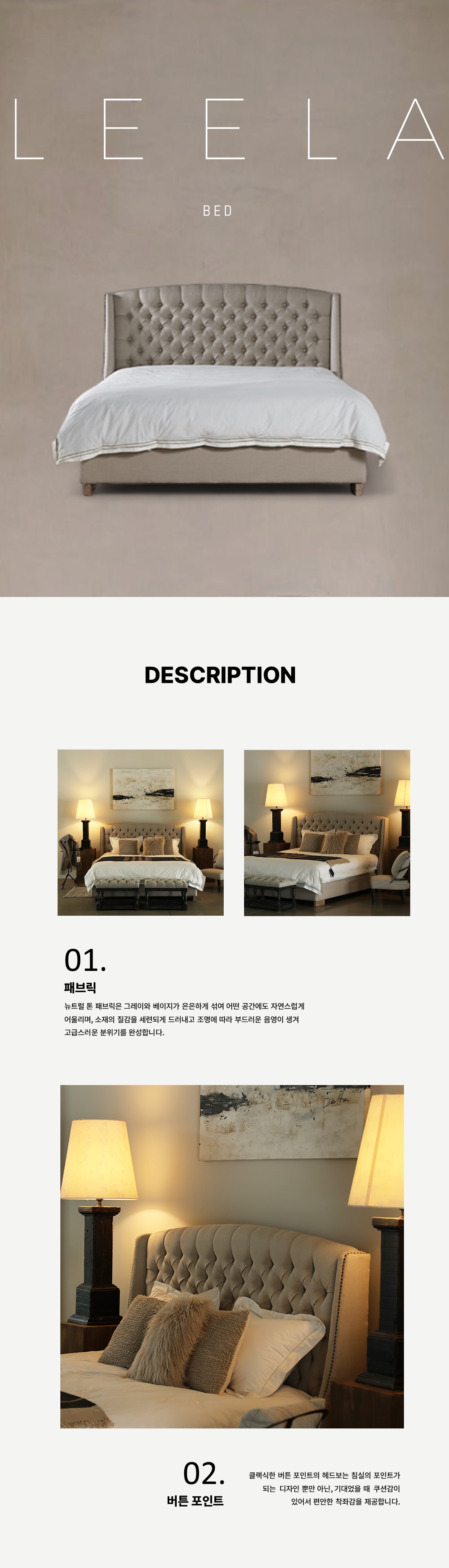따뜻하고 포근한 베이지색으로 인테리어 공간을 아늑하게 만들어주는 '릴라 침대'입니다.