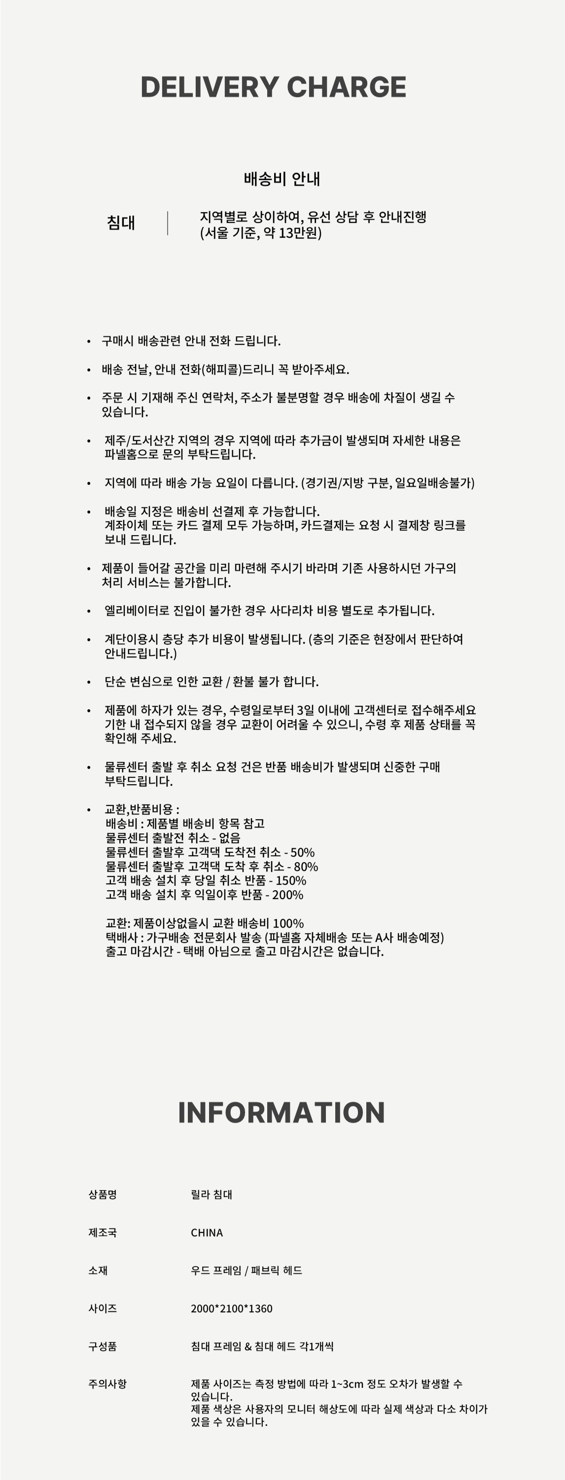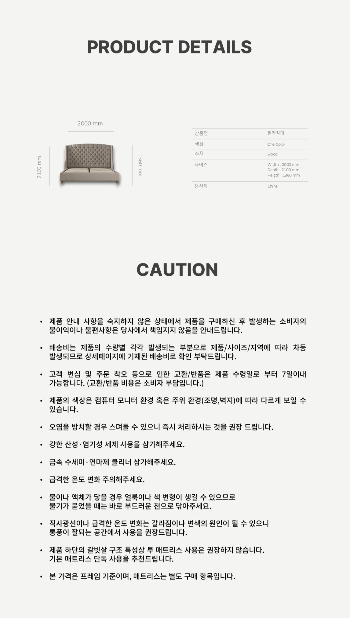 2000*1800*1360(침대 헤드 포함 높이)